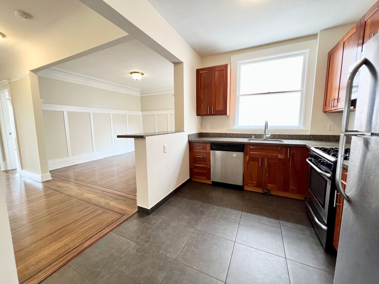 New kitchen with stainless steel appliances.